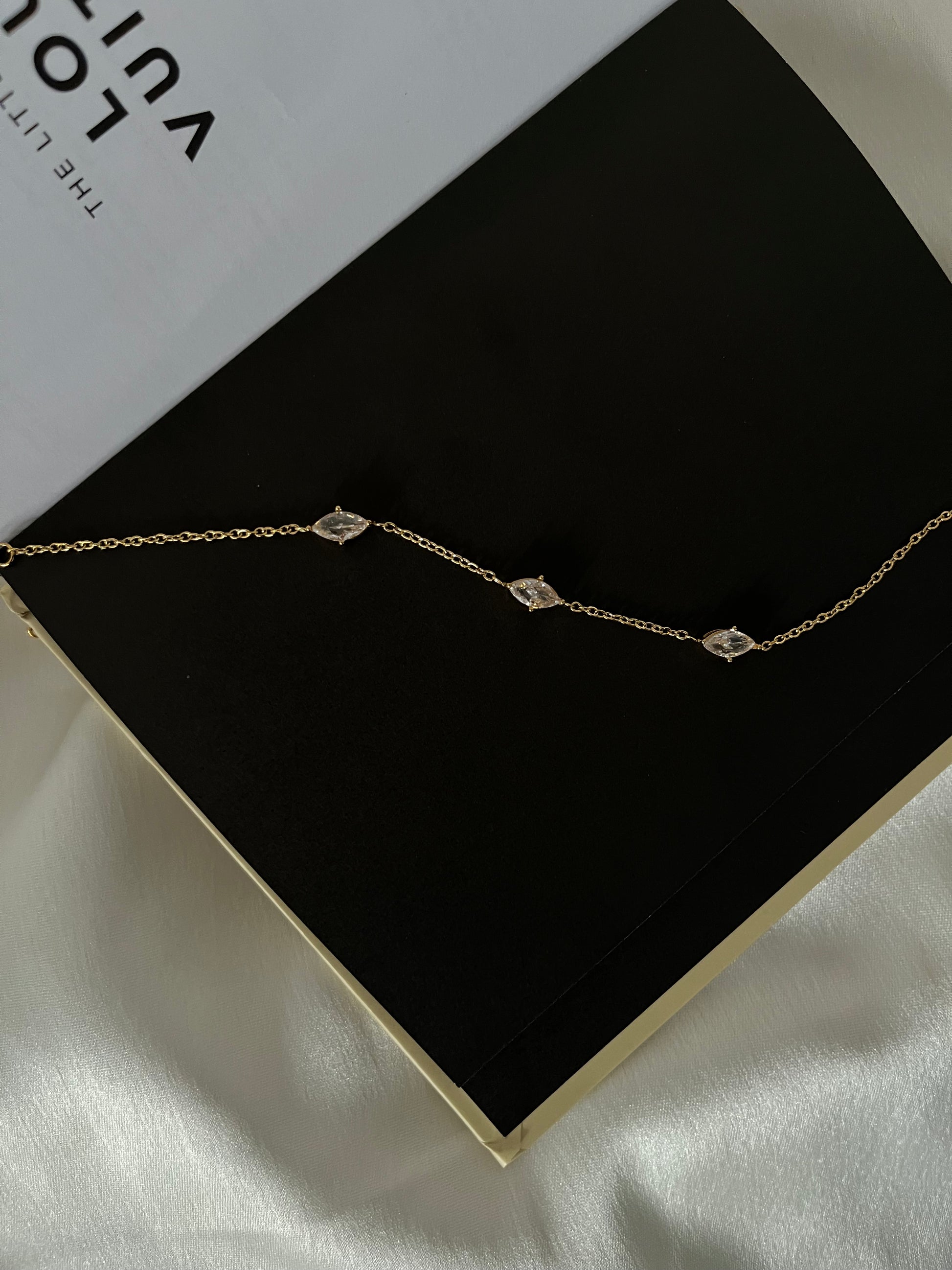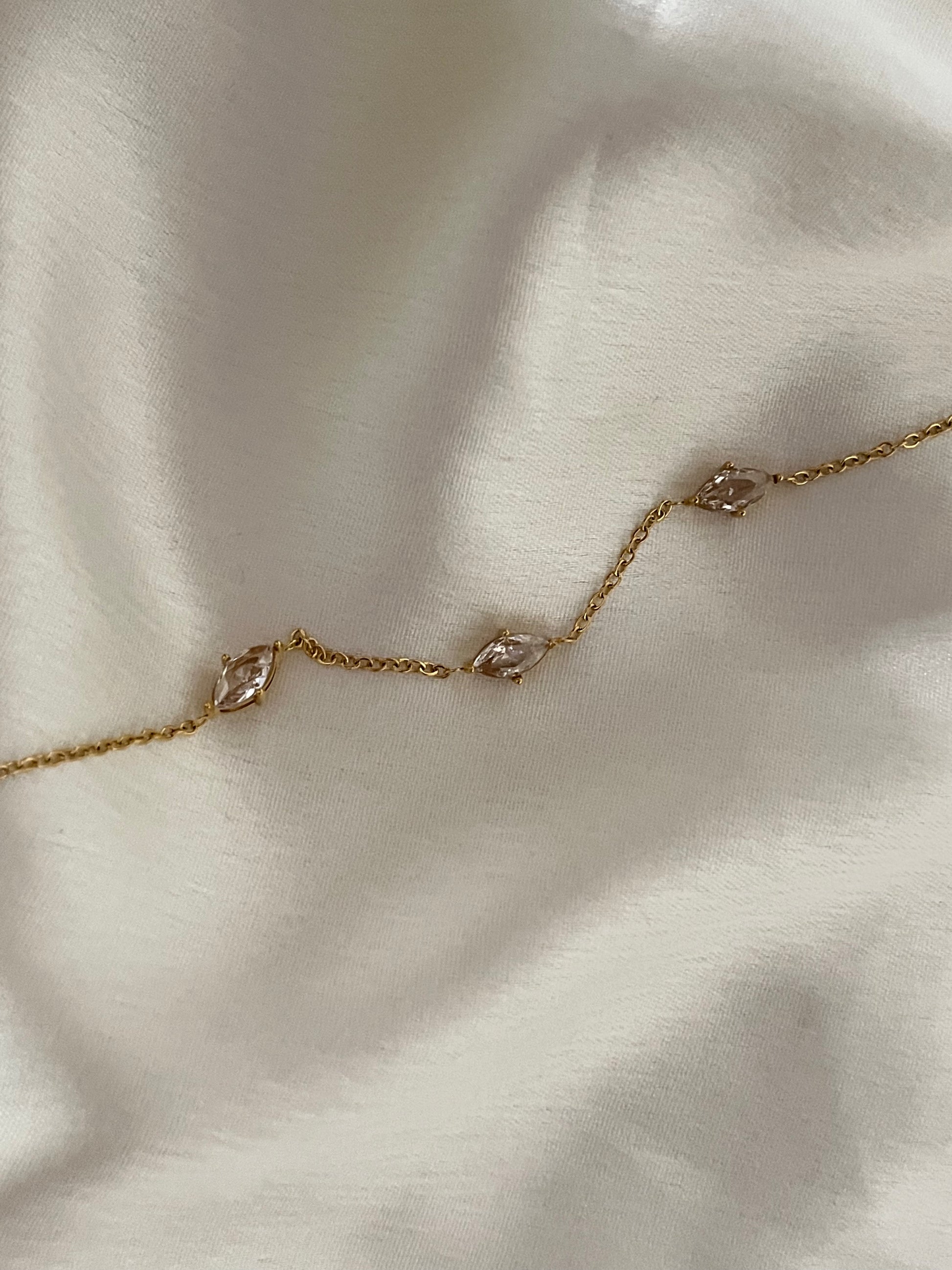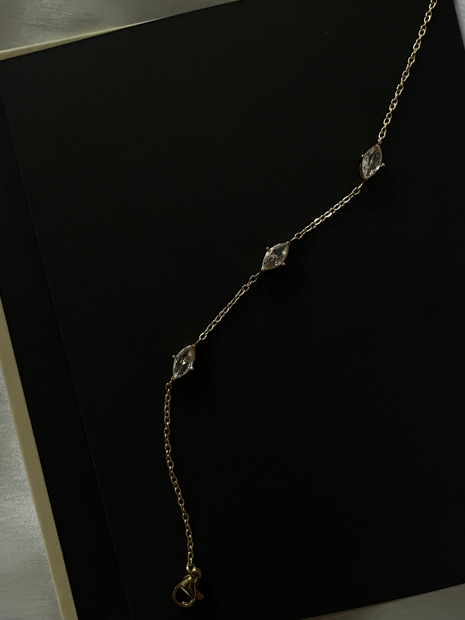 This bracelet is all about soft shimmer—tiny marquise-cut crystals linked with fine gold chain, giving major clean girl with taste energy.