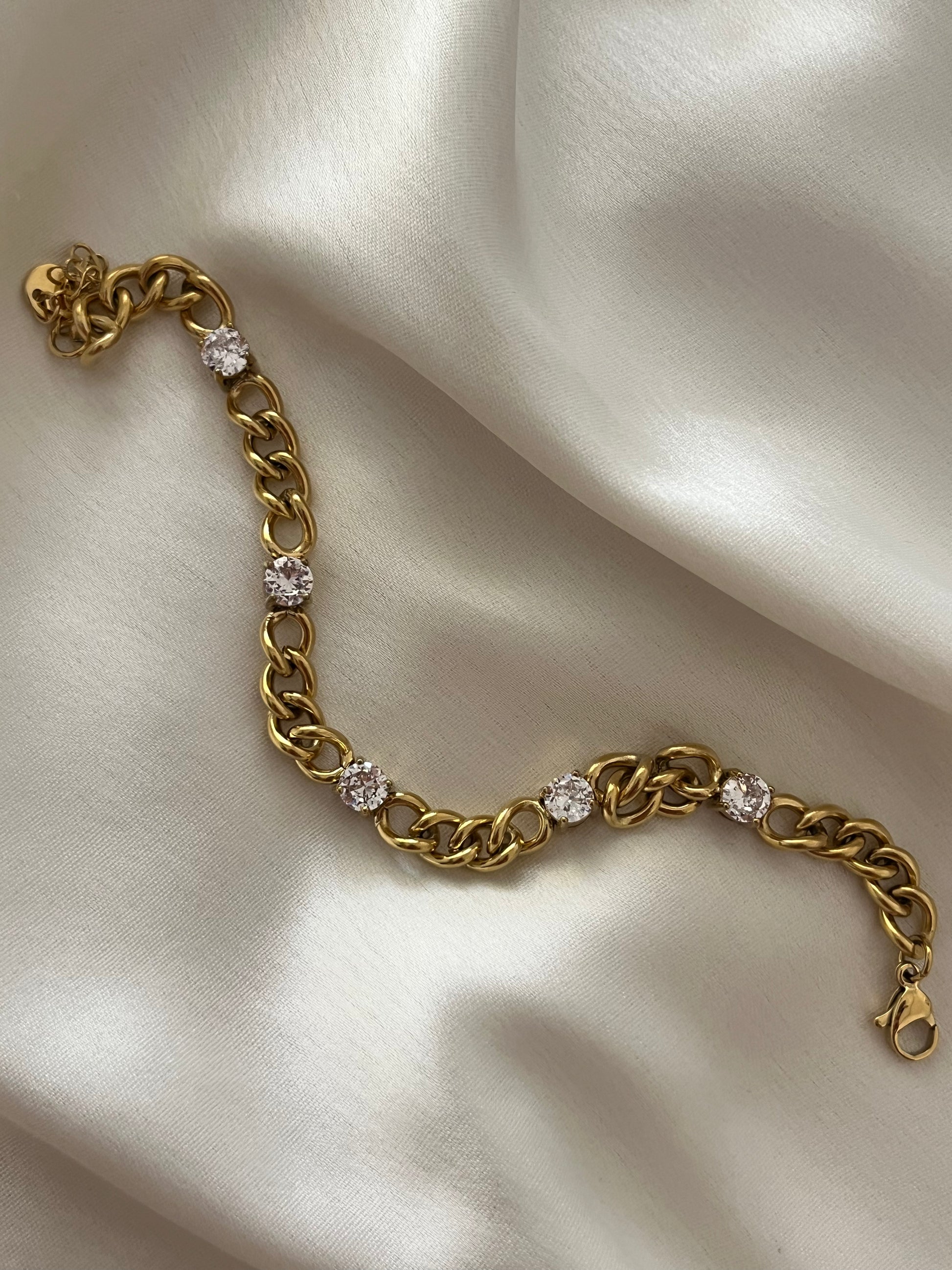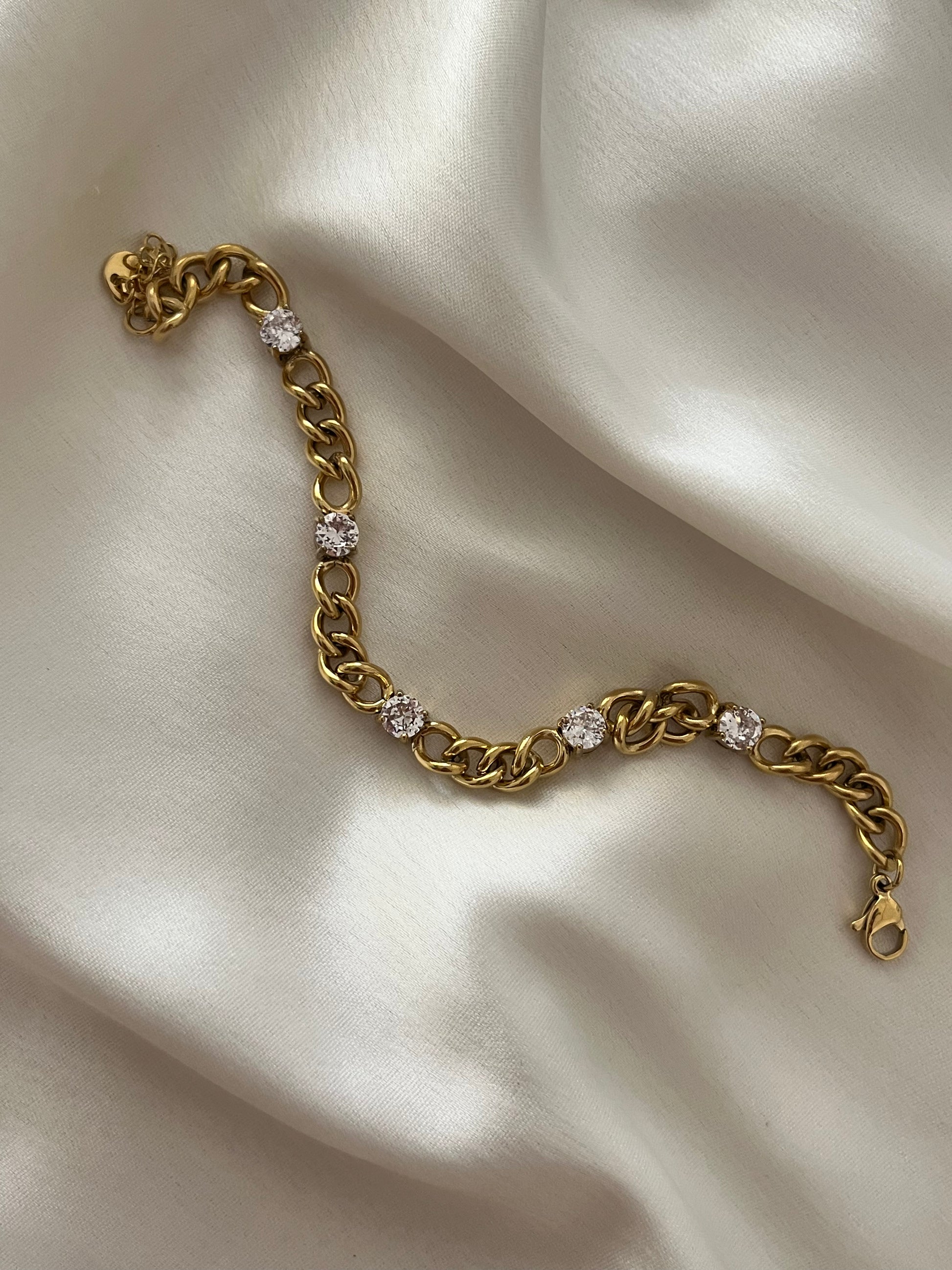 This chunky gold chain bracelet is the kind of statement piece that says “I’ve arrived” without even trying. The sparkle between the links? That’s just the main character energy peeking through.